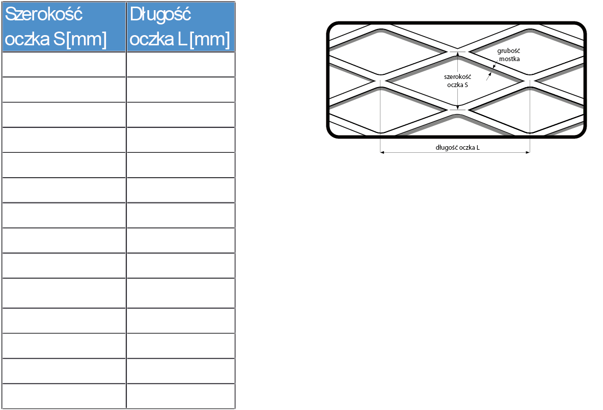 Maksymalna szerokość siatki to 1250 mm. Z kolei oczka mają wymiar od 4 do 75 mm długości i od 2 do 25 mm szerokości.